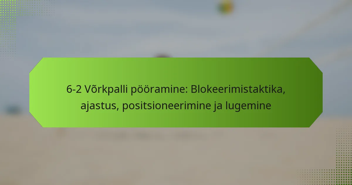Peamised blokeerimise taktikad 6-2 võrkpalli pöördes keskenduvad positsioneerimisele, ajastusele ja tõhusale suhtlemisele blokeerijate vahel. Need taktikad on hädavajalikud, et edukalt kaitsta erinevate rünnakustiilide vastu ja tagada, et meeskond säilitab tugeva kaitse kohaloleku võrgu ääres.